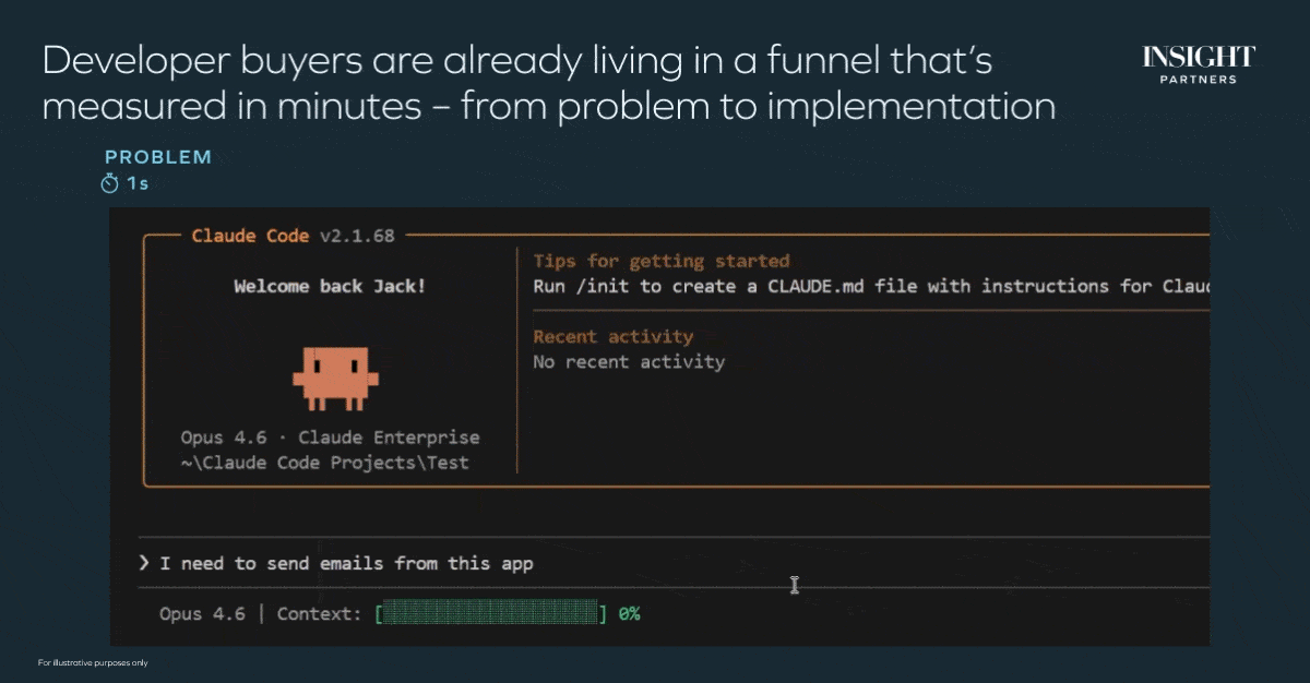 The gif below shows a real-life use case of a developer in Claude Code moving through each traditional phase of the funnel — from problem to implementation — in less than four minutes.