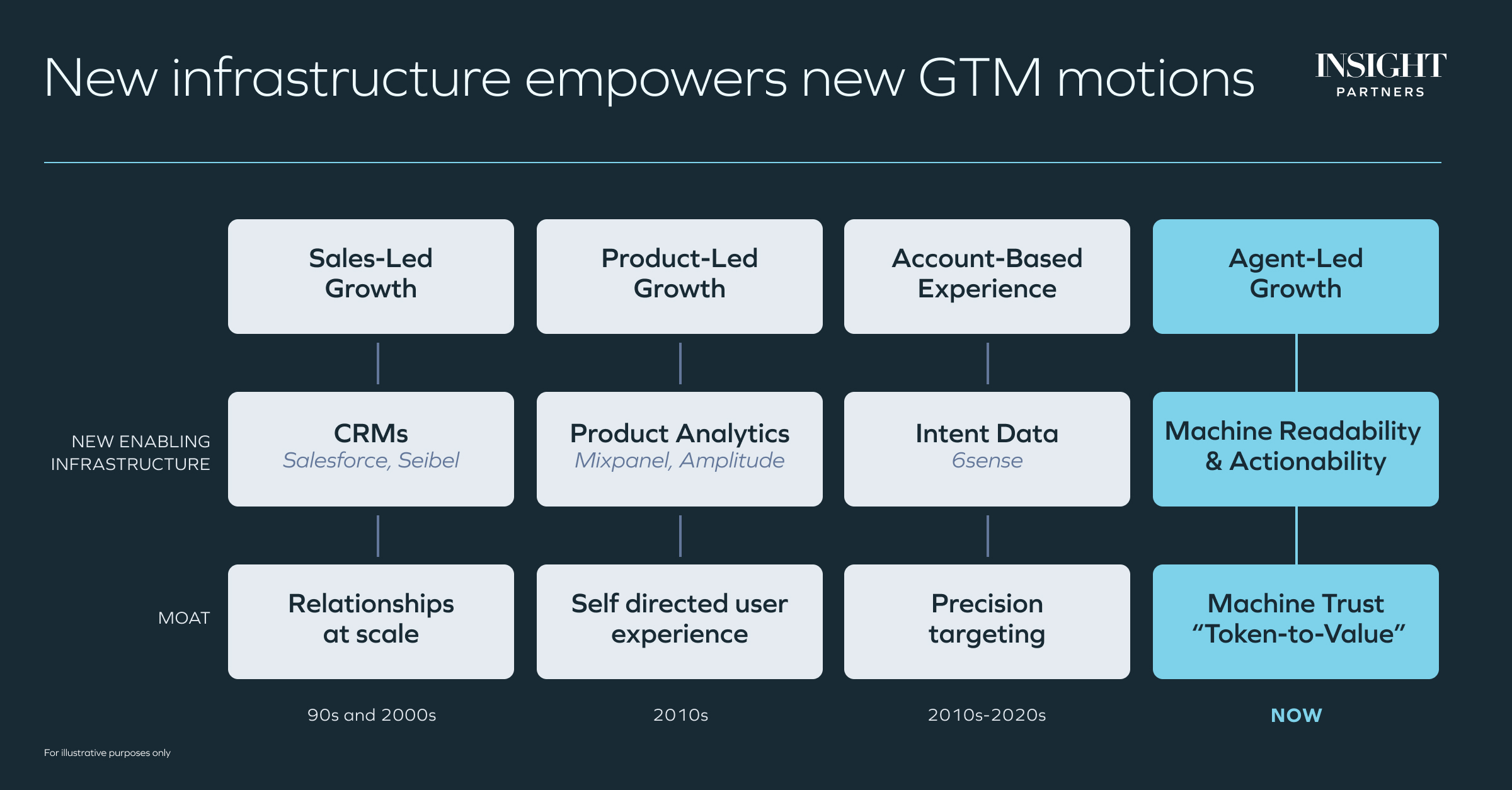 Many dominant GTM motions in enterprise software were unlocked by a new layer of enabling infrastructure. Sales-led growth has always existed, but became scalable when CRMs like Salesforce gave sellers relationships at scale. From Insight’s perspective, product-led growth reached efficiencies when product analytics tools like Mixpanel and Amplitude made self-directed user experiences measurable and repeatable. Account-based experience crystallized when intent data platforms like 6sense* enabled precision targeting at the account level.