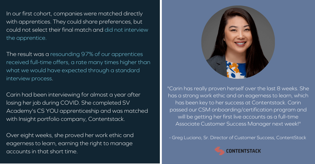 See below for a case study proven out from SV Academy’s CS YOU program where Carin conducted an apprenticeship with our portfolio company, Contentstack.