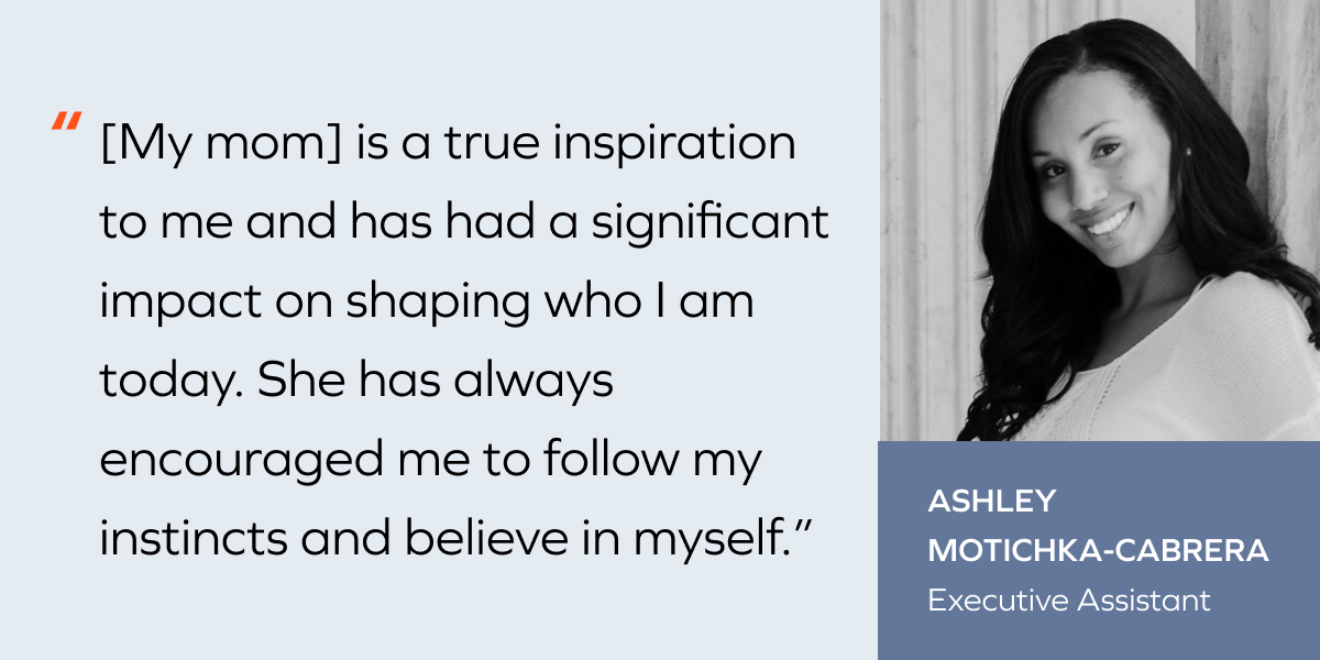 Ashley Motichka-Cabrera: My Mom. She is a true inspiration to me and has had a significant impact on shaping who I am today. She has always encouraged me to follow my instincts and believe in myself. I have always admired her strong work ethic and ability to balance motherhood with her career. She has excelled at work, yet I never felt that she wasn’t present while I was growing up. Being a working mother presents a unique set of challenges, and now that I am also one, I appreciate her and her sacrifices that much more.