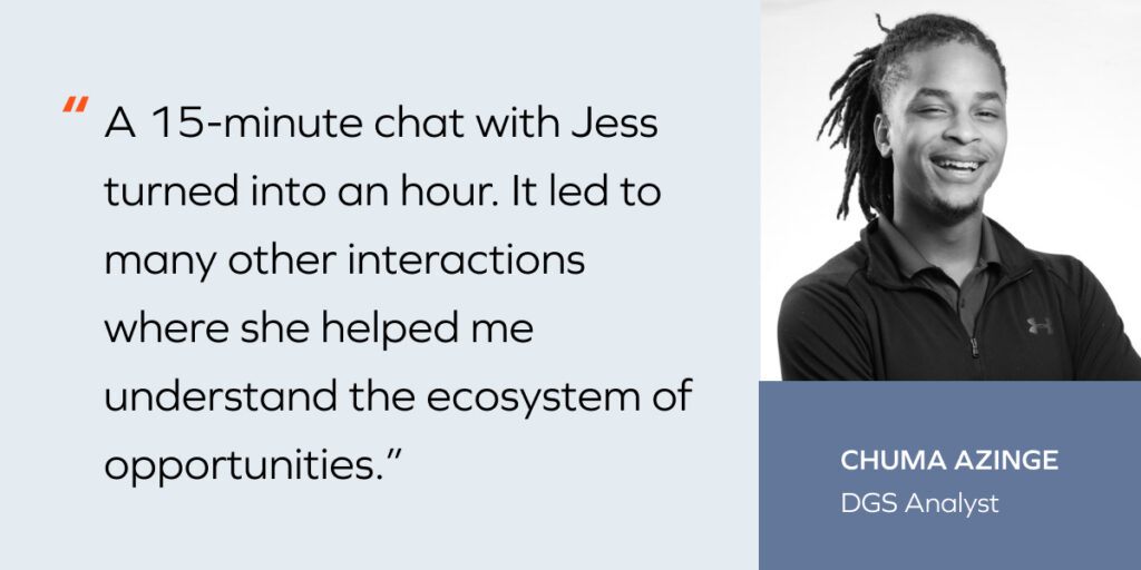 Chuma Azinge: Jessica Parry, a principal at Blackstone and fellow Georgetown alum, was a mentor who had an outsized impact on my career pursuits. With no prior exposure/connection to the finance industry I was advised to send cold emails in pursuit of a short conversation, and she was the first to respond! A 15-minute chat with Jess turned into an hour, and led to many other interactions where she helped me understand the ecosystem of opportunities within the industry, build connections, and navigate career opportunities as they arose.