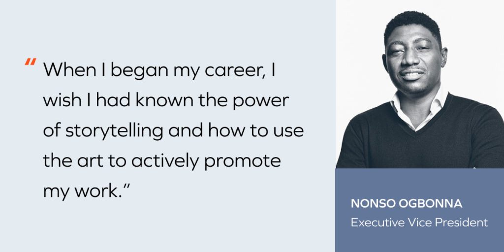 Nonso Ogbonna: When I began my career, I wish I had known the power of storytelling and how to use the art to actively promote my work. Staying heads down and merely focusing on doing a great job isn’t sufficient to advance your career, as your work may not always speak for itself.