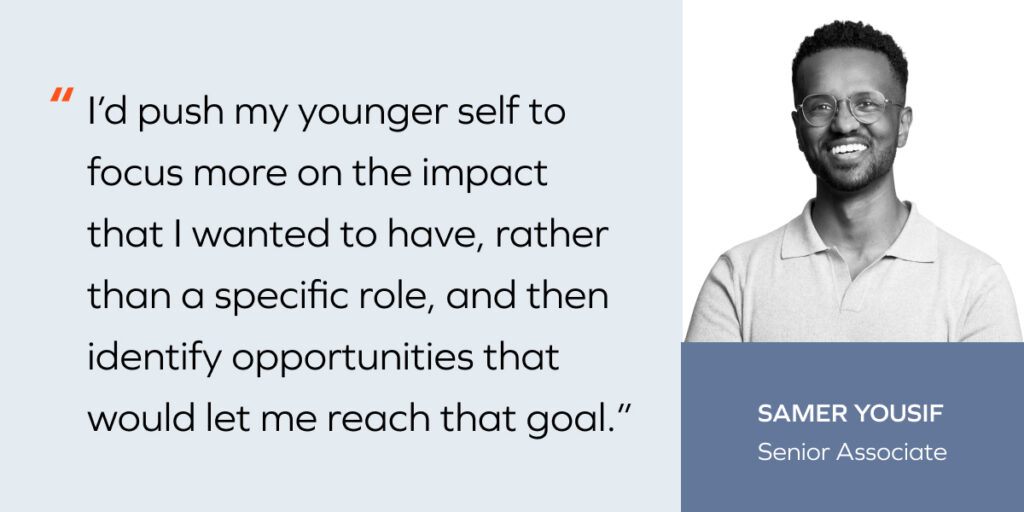 Samer Yousif: I’ve been blessed with incredible mentors and sponsors throughout my career. I absolutely wouldn’t be here without them taking me under their wing and supporting me throughout my career. A mentor of mine, who has become a close friend, was one of the first to vouch for me, adding me to projects and initiatives that would help me learn and network early on in my career.