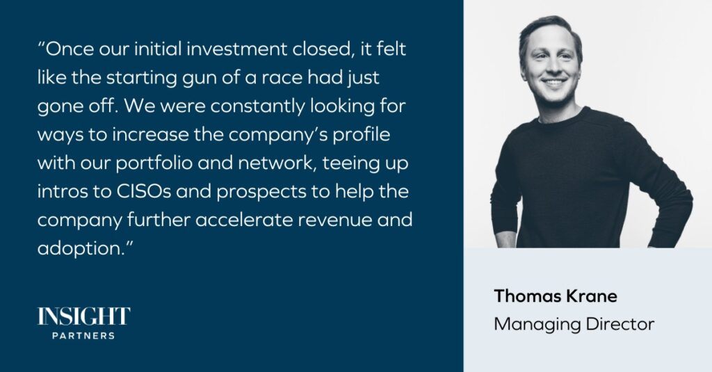 “Once our initial investment closed, it felt like the starting gun of a race had just gone off,” says Krane. “We were constantly looking for ways to increase the company’s profile with our portfolio and network, teeing up intros to CISOs and prospects to help the company further accelerate revenue and adoption.”