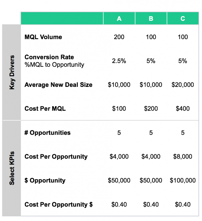 If you just looked at MQL volume, a commonly used marketing KPI, you would conclude that scenario A at 200 MQLs is better than scenario B at 100 MQLs. However, when you factor in the conversion rates, the number of opportunities is the same. In a world where the average deal size is the same, the opportunity dollars is also the same. If you assume the same sales execution, you are probably equally happy with A and B. You may even prefer B since there are fewer leads for sales to manage.