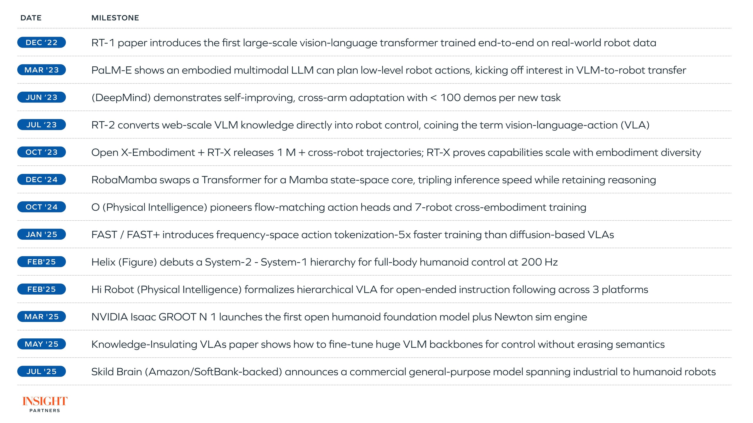 VLMs evolved into vision-language-action (VLA) models like RT-2, which extended those multimodal representations to action space – allowing robots to apply knowledge learned from text, images, and video to physical tasks. Since then, progress has accelerated, with multiple research groups racing to build true adaptive learning models that can execute new tasks without retraining.